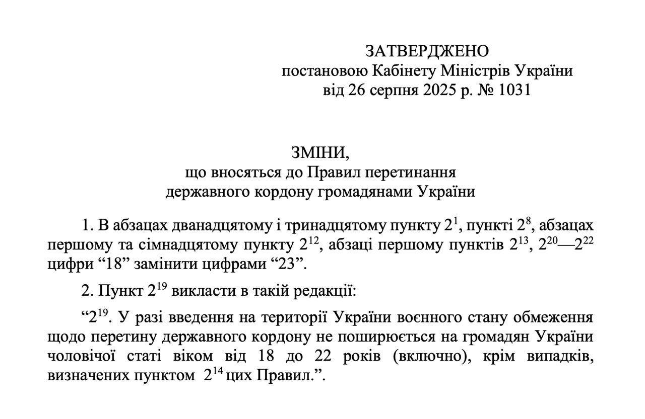 Кабінет міністр опублікував постанову про внесення змін до правил перетинання державного кордону. Перетинати кордон зможуть чоловіки 18-22 років включно.