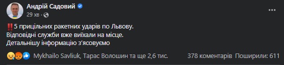 Міський голова Львова Андрій Садовий заявив про п'ять ракетних влучань по місту, у той же час голова Львівської ОДА Максим Козицький озвучив, що за попередньою інформацією було чотири ракетні удари, повідомляє Фіртка.