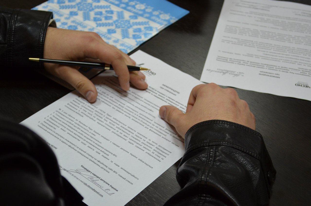 Кандидат в народні депутати України Олександр Шевченко підписав сьогодні Меморандум про співпрацю з учасниками Громадського Руху ЧЕСНО.
