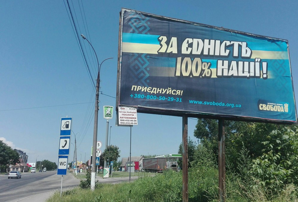 У Калуші, Коломиї та Івано-Франківську спостерігачі виявили оформлені неналежним чином білборди із написом «За єдність 100% нації. Приєднуйся!» із агітацією за ВО «Свобода».