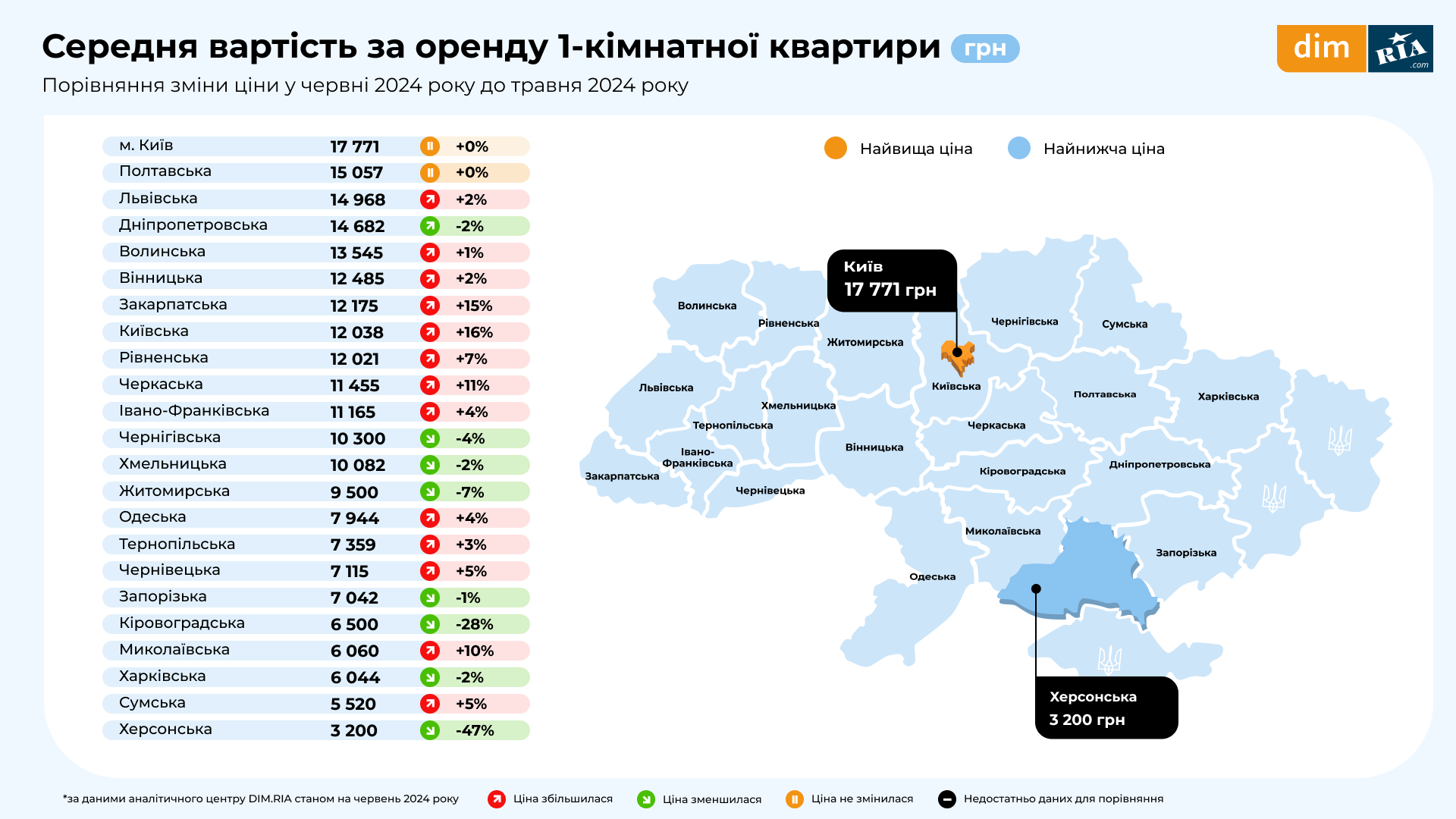 Лідером з вартості, як і у попередні періоди, лишається Київ з середньою ціною оренди однокімнатної квартири 17 771 гривні.