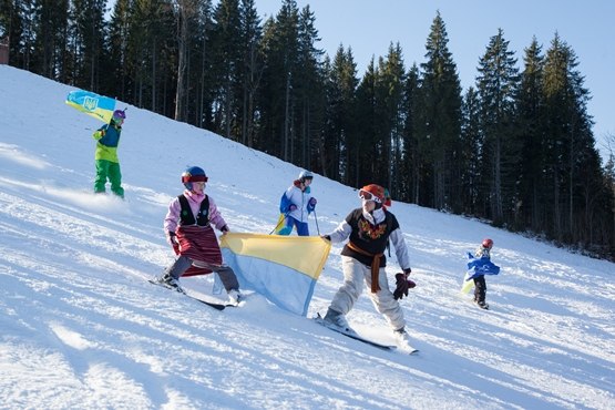 На "Буковелі" розпочався лижний сезон. Більше тисячі людей зібралися на одному зі схилів, аби запустити у небо жовто-блакитні кульки, заспівати гімн України та зрештою з’їхати вниз на лижах та сноубордах під національними прапорами.