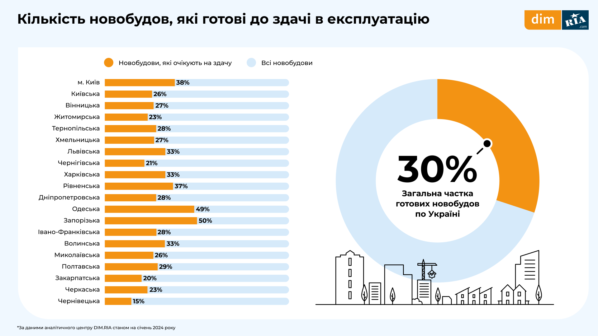 "За перший місяць року по всій країні здали дві новобудови на п'ять секцій. Від липня 2023 року до кінця січня 2024 року готові до експлуатації 74 будинки на 139 секцій.Найбільша кількість готових новобудов за цей період у Київській області. Загалом станом січень частка готових новобудов від загальної кількості становить 30%", – зазначають дослідники.