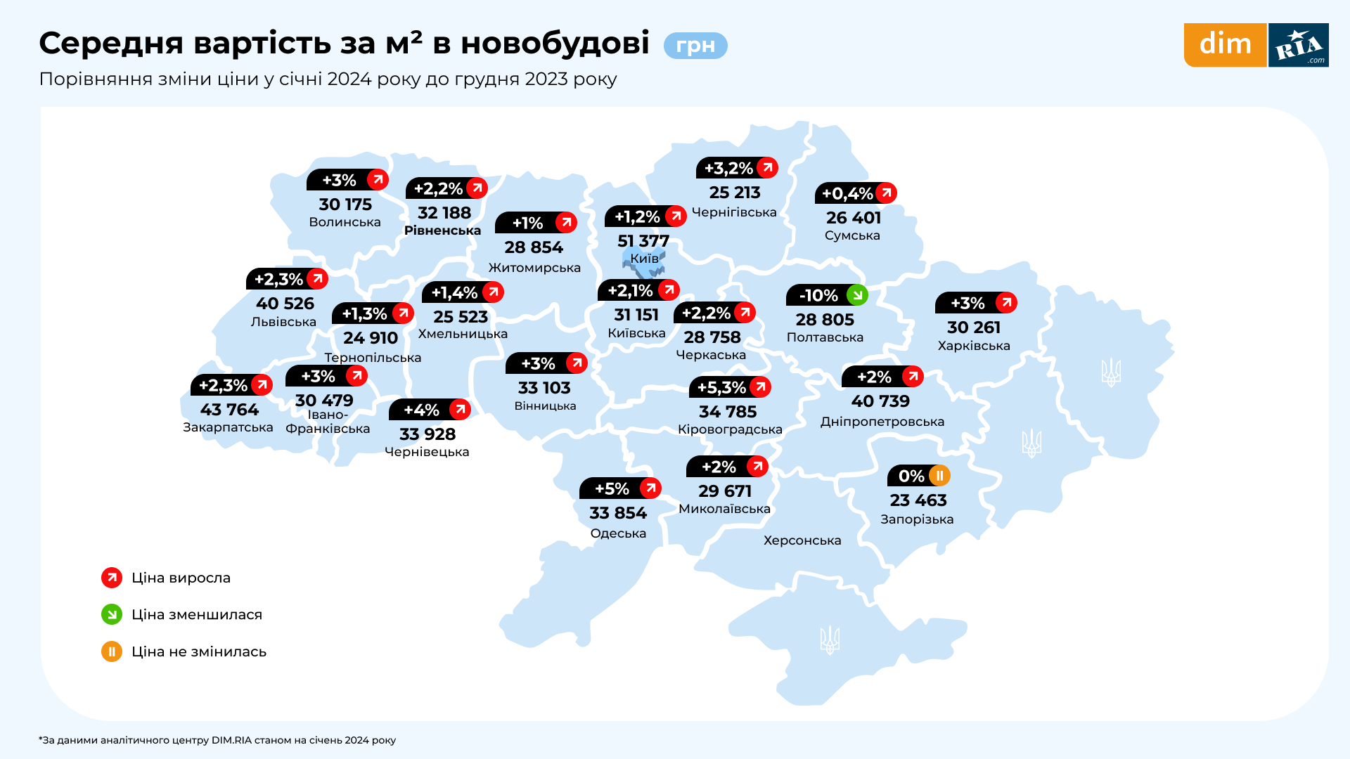 Станом на січень 2024 року найвища середня вартість за м² у столиці й складає 51 377 гривень (враховуючи всі типи квартир за кількістю кімнат). За місяць ціна за м² зменшилася у Полтавській області, проте у Кіровоградській та Одеській областях збільшилася на 5%.
