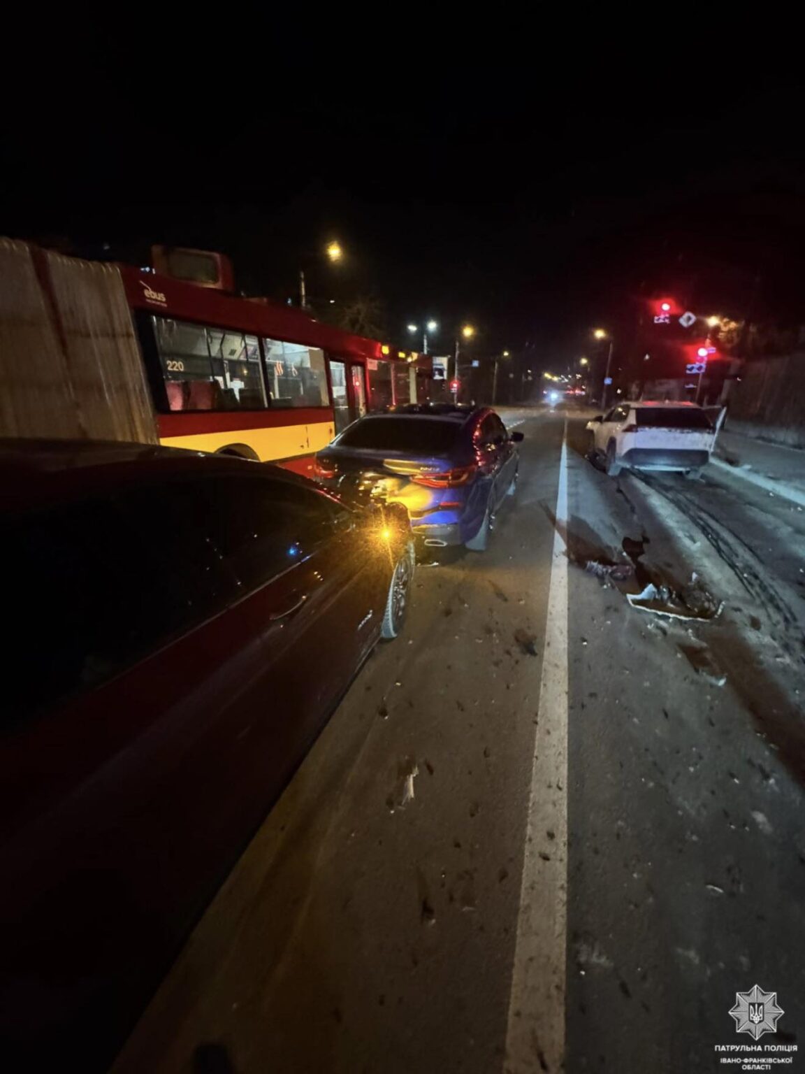 Грудень 2025, Івано-Франківськ: на вулиці Галицькій нетверезий водій Toyota (відмовився від освідування) спричинив ланцюгове зіткнення трьох автомобілів (Toyota, Ford та BMW).