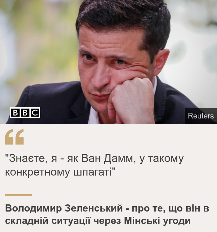 “Знаєте, я, як Ван Дамм, у такому конкретному шпагаті знаходжусь. Було б три ноги - мене б на три посадили", - про те, що він опинився у складній ситуації через Мінські угоди. Зокрема президент поскаржився, що в цих угодах є домовленості про відведення ділянок, які "ми не можемо собі дозволити".