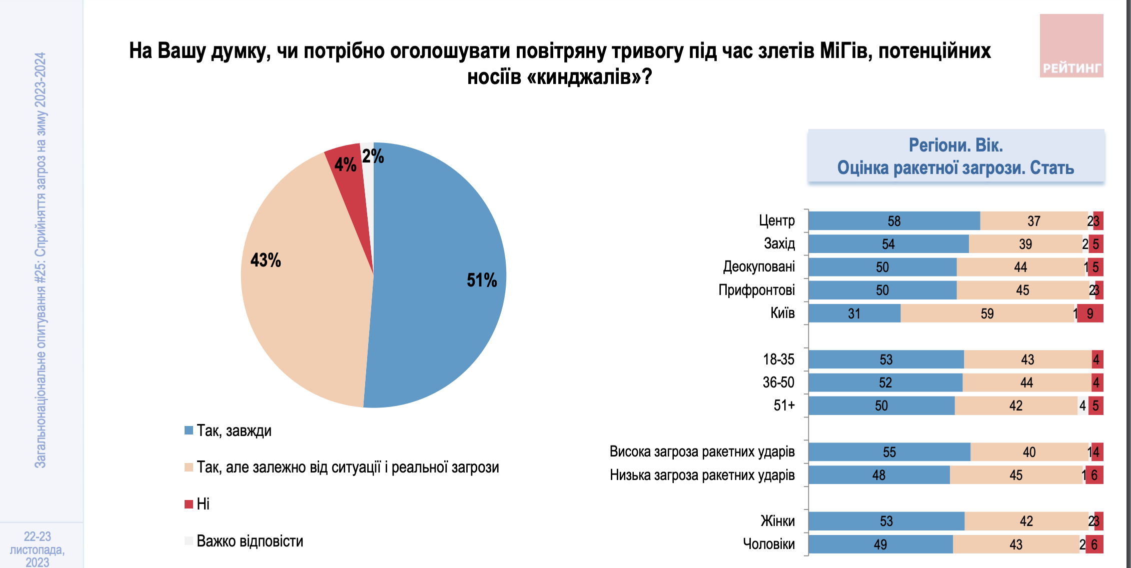 Половина (51%) українців вважають, що завжди необхідно оголошувати повітряну тривогу під час злетів МіГів потенційних носіїв “кинджалів”.