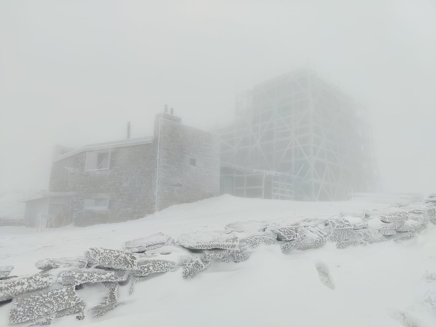На Піп Івані, що у Карпатах, обмежена видимість і падає сніг.