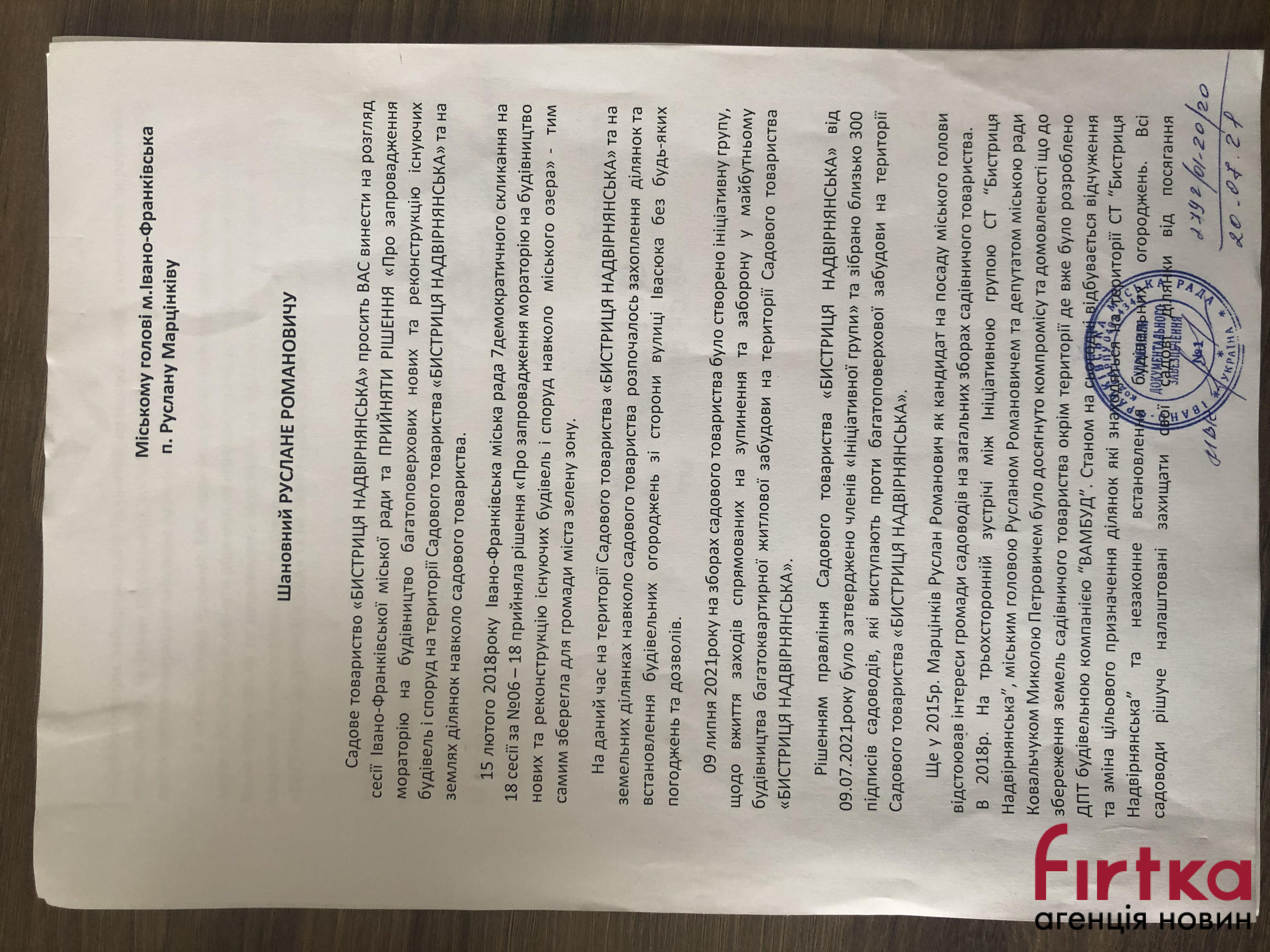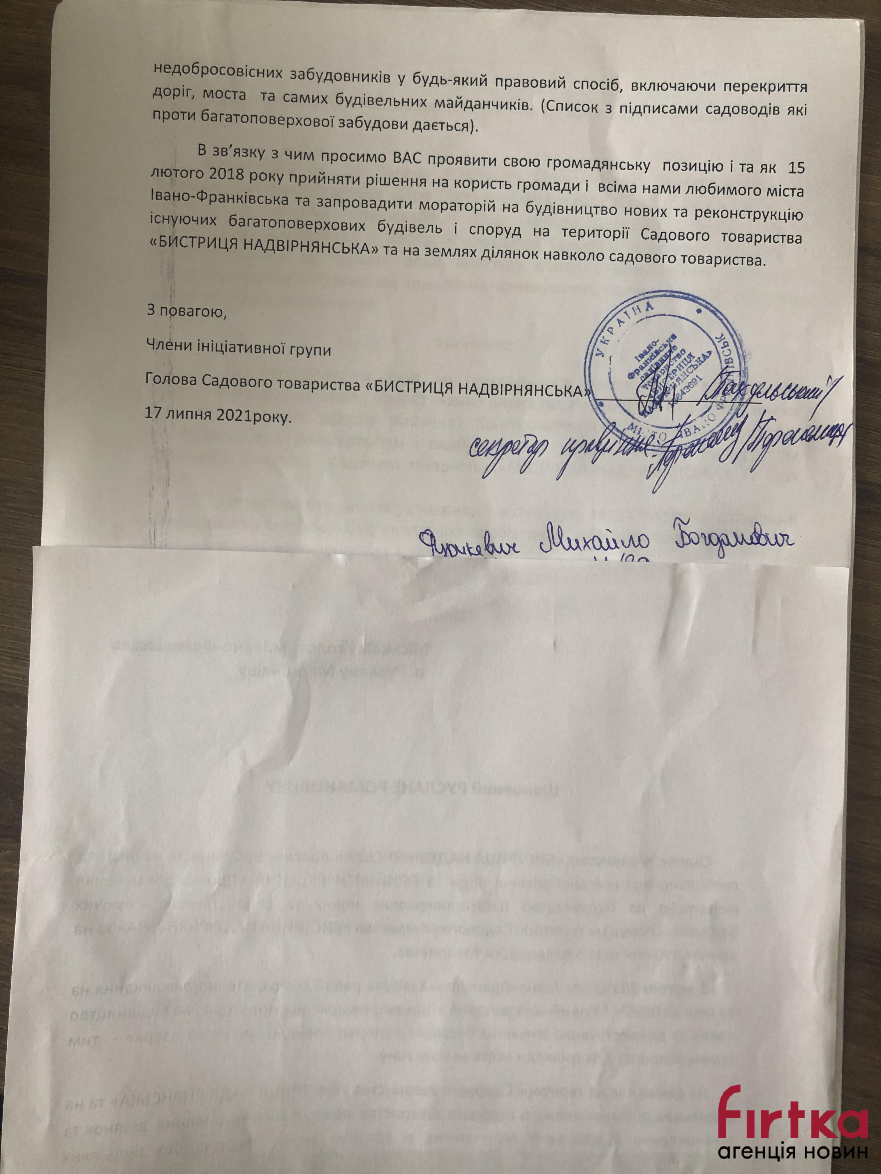 "Ще у 2015 році на тристоронній зустрічі між ініціативною групою СТ "Бистриця Надвірнянська" міським головою Русланом Марцінківим та депутатом міськради Миколою Ковальчуком досягнуто домовленості щодо збереження земель товариства окрім територій, де вже розроблені ДПТ однією з будівельних компаній. Станом на сьогодні відбувається відчуження та зміна цільового призначення ділянок, що знаходяться на території товариства та незаконне встановлення будівельних огороджень", - розповів Фіртці один з учасників акції Ярослав Руміш.