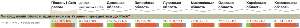 Вісім областей Південного Сходу — всі сусіди Криму. Хто — географічний; хто — ментальний. Думка сусідів про те, що сталося з українським півостровом, розділилася рівно навпіл. 44,3% вважають, що приєднання Криму до Росії — "результат незаконної анексії". В авангарді такої позиції — наїжачені Миколаївська (68,2%); Дніпропетровська (61,1%); Херсонська (56,7%); а також Запорізька (53,6%) області. Загальний показник високої температури знижують Донецька (25,7%) і Луганська (26,8%) області. Ввічливе ставлення до "ввічливих людей". Менше половини жителів Одещини і Харківщини вважають приєднання Криму до Росії незаконною анексією — 46,9 і 42,8%, відповідно.