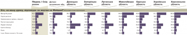 Відповідальність за жертви, на думку опитаних, несуть обидві сторони. Вину за кров респонденти покладають і на переможців (лідерів опозиції — 37,5%, протестувальників — 10,3%), і на переможених (Віктор Янукович — 45,1%, Партія регіонів — 17,2%). Найбільше екс-гаранта схильні звинувачувати на Херсонщині й Миколаївщині, найменше — на Донбасі. Прогнозовано. "Руку Заходу" в тому, що сталося, вбачають 18,4%, "руку Москви" — лише 4,8%. Привертає увагу, що вина політиків бачиться більш очевидною, ніж вина безпосередніх учасників сутичок. "Беркут", ВВ та інших силовиків вважають відповідальними за кров тільки 8,2% (у Донецькій області — 3%), про вину протестувальників — дивися вище. 64,7% погодилися, що люди в погонах лише виконували накази, відповідальність за які мають нести ті, хто їх віддавав. Цю думку поділяють понад половину опитаних в усіх восьми регіонах. Найпопулярніша вона, звісно, в Донецькій області — 73%. Але при цьому звернімо увагу, що вона однаково популярна у відносно полярних регіонах, наприклад на Луганщині й на Херсонщині. В обох випадках — по 66,3%. Тільки 21% вважає, що силовики свідомо виконували свідомо злочинні накази, а тому також відповідальні за жертви. Украй непопулярна така точка зору на Донеччині (12,4%), відносно популярна в Миколаївській (30,5%) та Одеській (29,6%) областях.