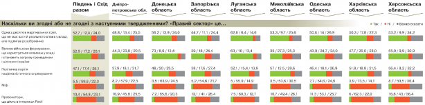 Якщо маленького комара розглядати під мікроскопом, він видасться чудовиськом. І Південний Схід розглядав — "Правий сектор". Благо було кому настроювати мікроскоп: на Південному Сході, як відомо, у пріоритетах значилися "Інтер", що шарахався від Льовочкіна до Фірташа, і стабільно "правдиві" російські телеканали. Зрозуміло, жодних фантазійних версій стосовно "ПС" народ не оцінив: 59% жителів Південного Сходу не згодні з тим, що "ПС" — породжений революцією міф. Навіть попри лютневі заяви лідера "ПС" Дмитра Яроша про наявність у його формування всього двохсот багнетів. Причому тенденція у всіх досліджуваних областях однакова. Ймовірно, тому, що для Південного Сходу цілком реальними стали: радикал з автоматом, який здійснив державний переворот; націоналіст, що збирає армію їхати на схід наводити лад; Сашко Білий — герой для своїх і не контрольований ніким бандит-рекетир для тих, хто перед телевізором...
