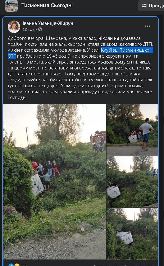 "...водій не справився з керуванням, та "злетів" з моста, який зараз знаходиться у жахливому стані, якщо на цьому мості не встановити огорожі, відповідних знаків, то така ДТП стане не останньою..", - написала Іванна Уманців-Жирун.