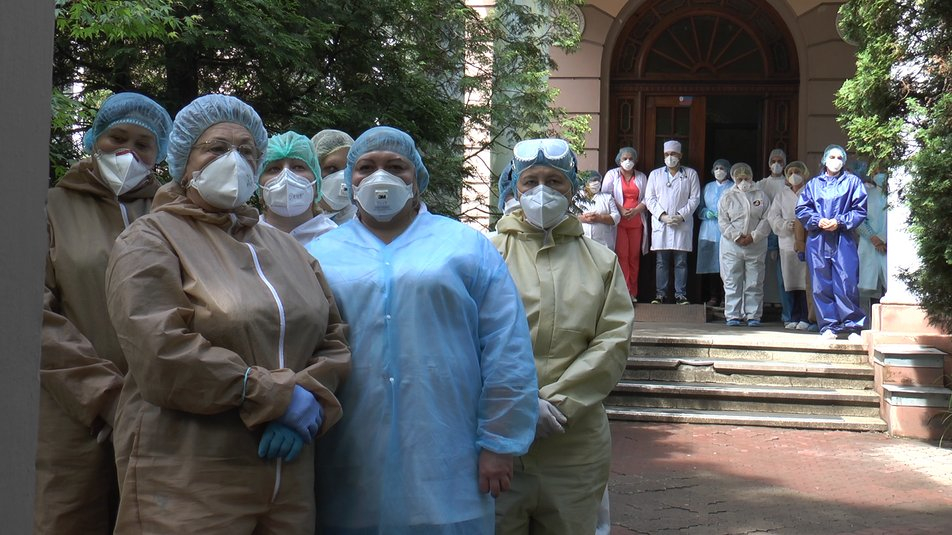 Одна із лікарень, яку відвідали, - обласний фтизіопульмонологічний центр. Працівники закладу вийшли на вулицю, деякі заглядали у вікна. Всі - у захисних костюмах.