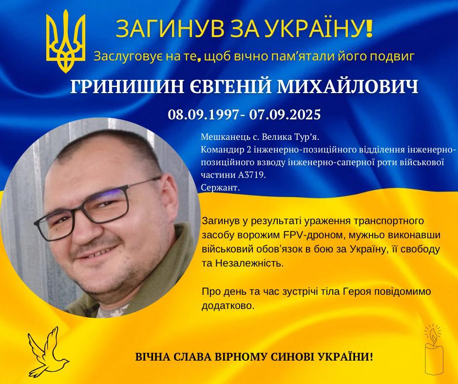 Посадовець додав, що Євгеній Гринишин загинув 7 вересня 2025 року — всього за день до свого дня народження.