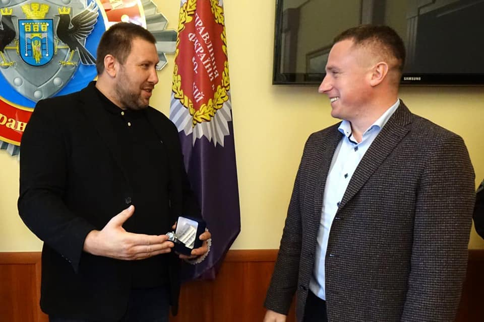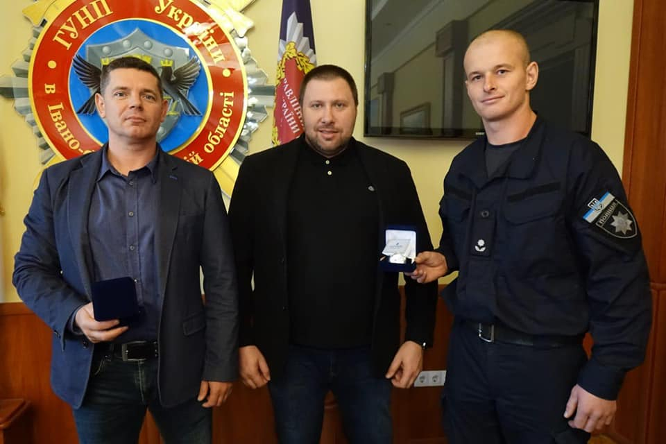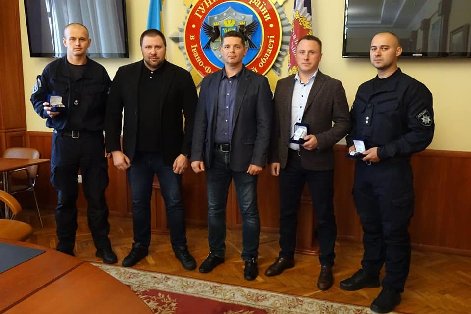 Прикарпатські правоохоронці Ігор Мартинюк і Мирон Гуменюк разом з адміністратором Територіального сервісного центру МВС в Івано-Франківсткій області Віталієм Середюком допомогли потерпілому та евакуювали його. Володимир Мартиненко подякував їм за врятоване життя і вручив відомчі годинники, а Ігорю Мартинюку ще й тактичний кашкет.
