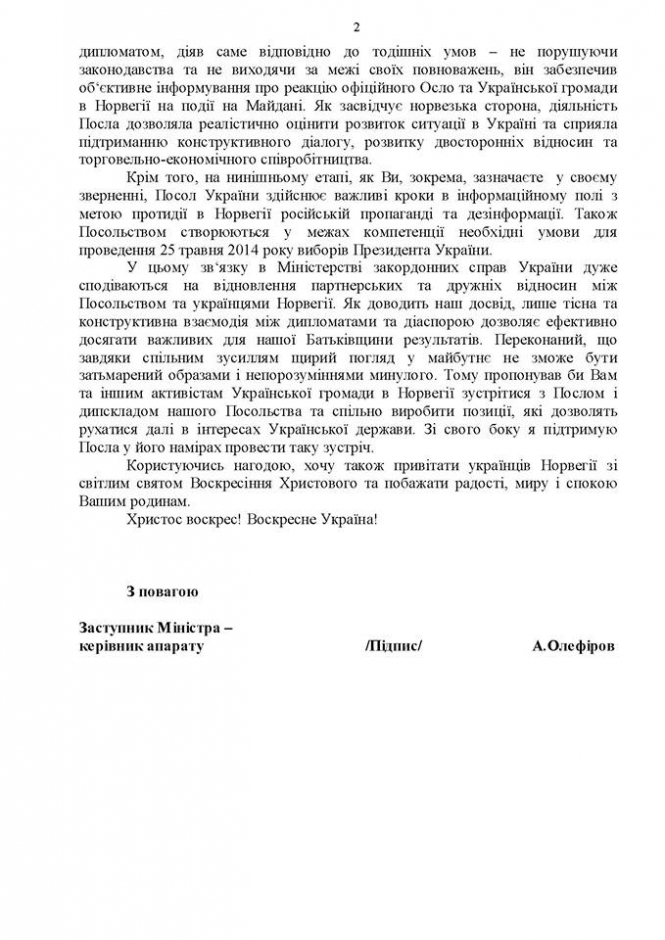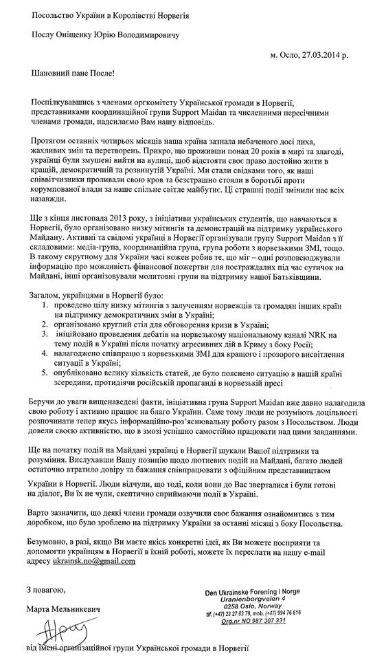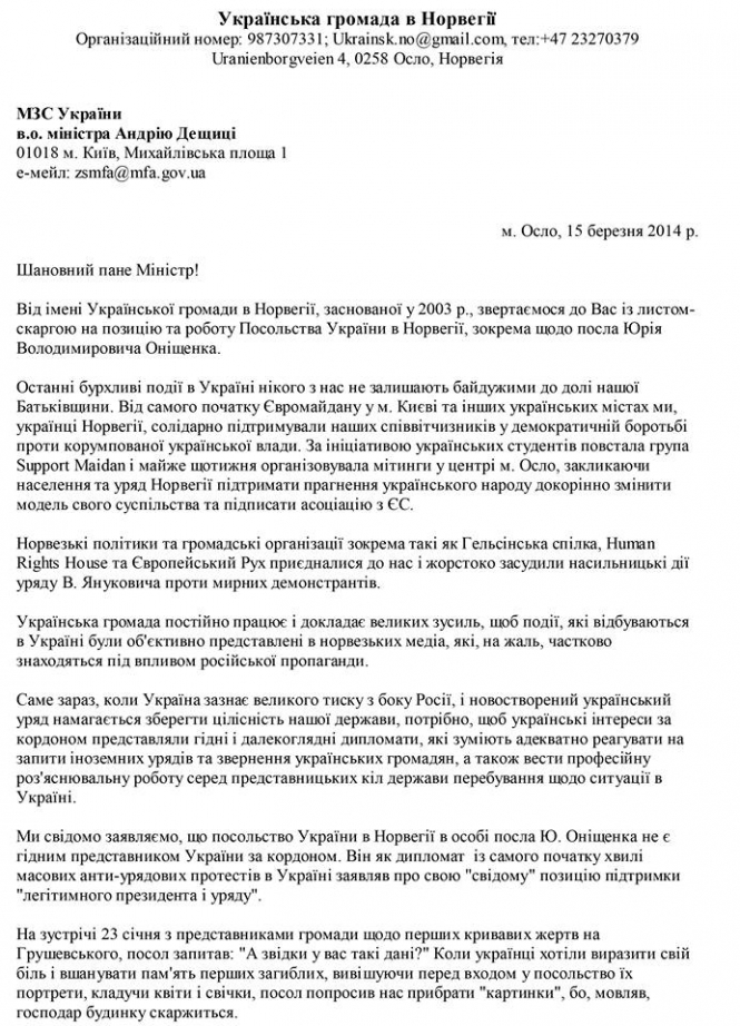 Лист Української громади в Норвегії до в.о. міністра МЗС України Андрія Дещиці: