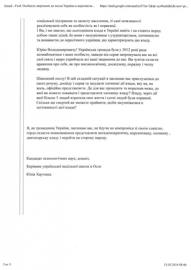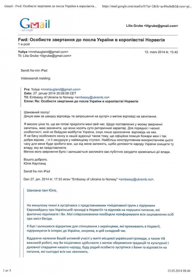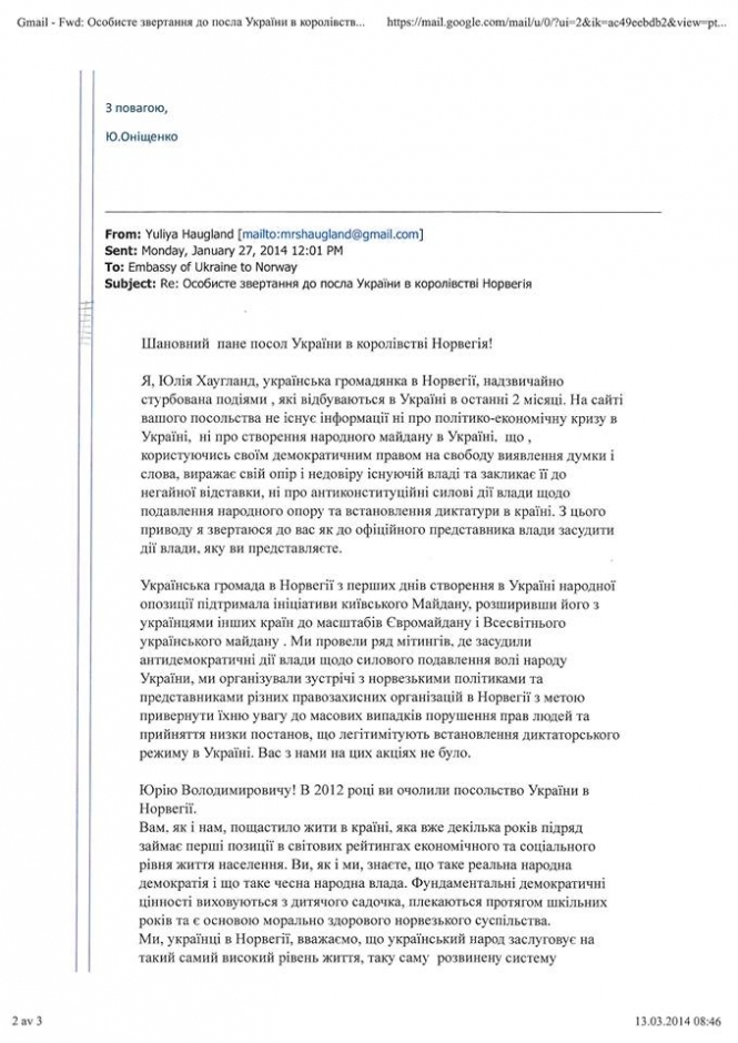Лист Юлії Хаугланд, представниці української діаспори в Норвегії до Юрія Оніщенка: