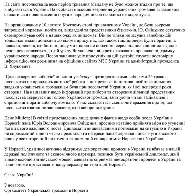 "Ми свідомо заявляємо, що посольство України в Норвегії в особі посла Ю.Оніщенка не є гідним представником України закордоном. Він як дипломат із самого початку хвилі масових антиурядових протестів в Україні заявляв про свою "свідому" позицію підтримки "легітимного уряду і президента", - писали українці, вимагаючи відставки Оніщенка.