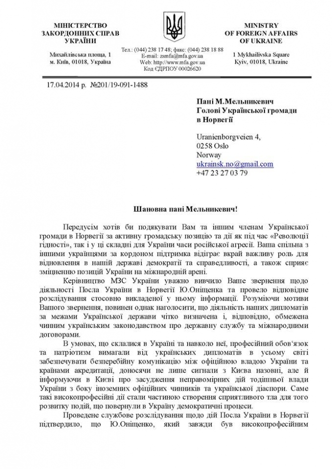 Відповідь МЗС України Українській громаді в Норвегії щодо їхнього прохання звільнити Юрія Оніщенка: