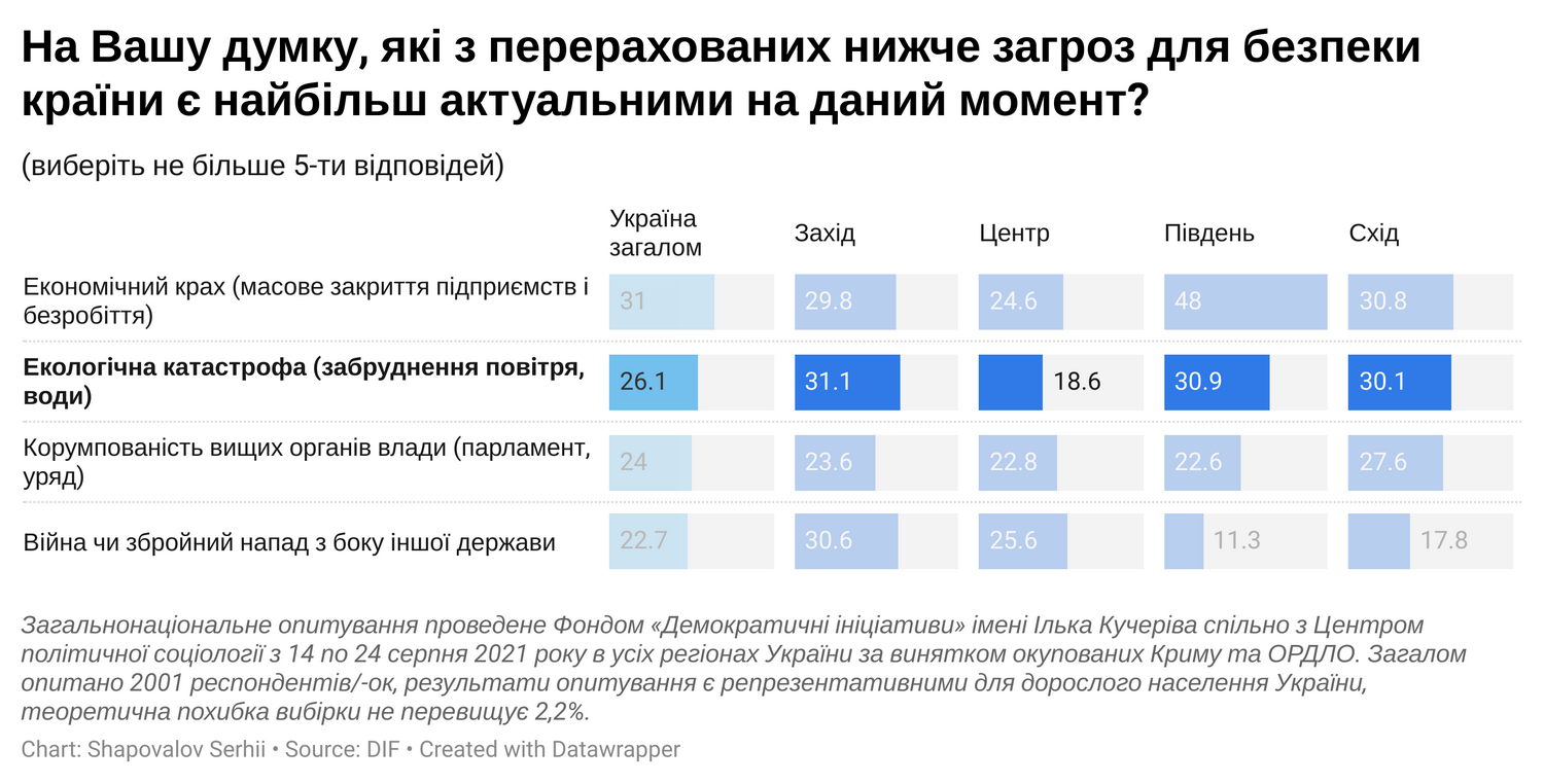 Понад 25% українців вважають проблеми екології однією з найактуальніших загроз для країни.