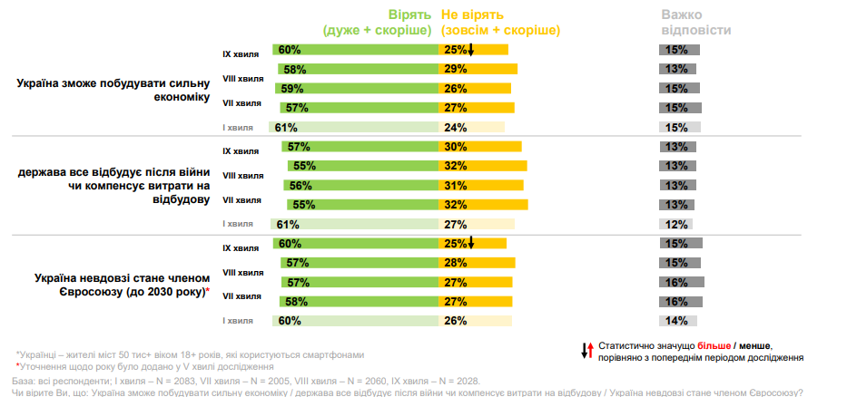 Загалом віра українців в те, що держава зможе побудувати сильну економіку, все відбудує після війни чи компенсує витрати на відбудову та невдовзі стане членом ЄС залишається без значущих змін – на рівні 55-58%.
