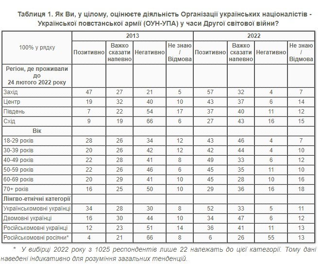Зокрема, соціологи у 2013 році поставили запитання українцям щодо сприйняття діяльності ОУН-УПА у часи Другої світової війни. У вересні 2022 року, соціологи повторили опитування.