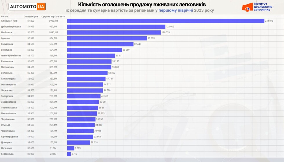 Найдешевшими (за середньою вартістю) легковики були у Херсонській ($3 000), Донецькій ($3 000), та Миколаївській ($3 900) областях, найдорожчі — у Києві та Київщині ($7 200), Львівській ($6 550) та Волинській ($6 400) областях.