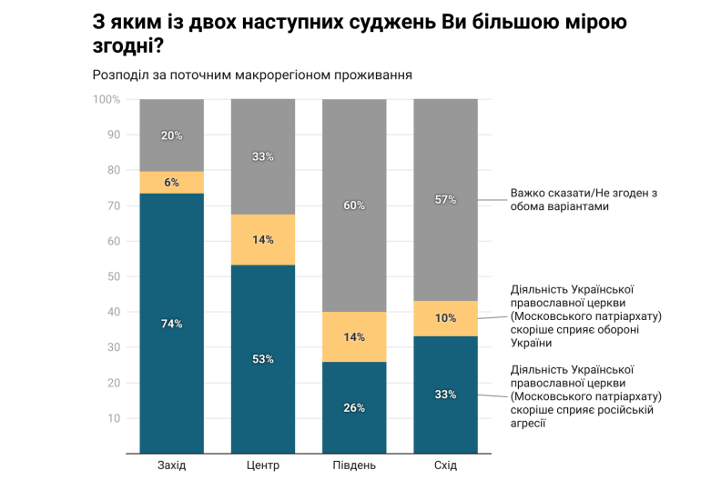 Проте, серед мешканців південних та східних областей значна частка вагається чи справді варто оцінювати церкву з позицій її ролі у війні. 60% громадян, що проживають у південних областях, та 57% тих, хто проживає у східних областях, не погодилися з тим, що УПЦ МП сприяє чи шкодить обороні держави.