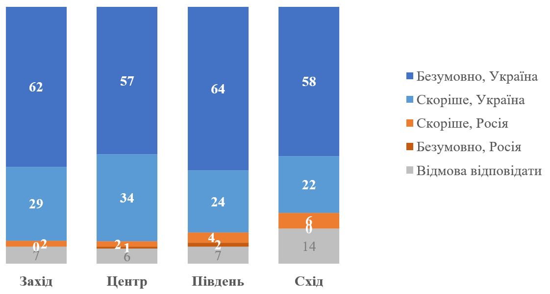 У всіх регіонах не менше 80% вірять у перемогу України й, зокрема, не менше 57% безумовно переконані в цьому. Зокрема, 62% мешканців західних областей безумовно переконані в перемозі України.