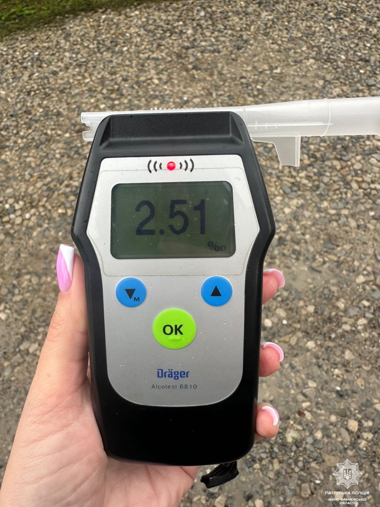 Спілкуючись з 63-річним водієм, поліцейські виявили ознаки сп'яніння. Чоловік пояснив, що вживав алкоголь після ДТП. Огляд, проведений на місці, показав — 2.51 проміле алкоголю в крові. Також водій не мав водійського посвідчення.