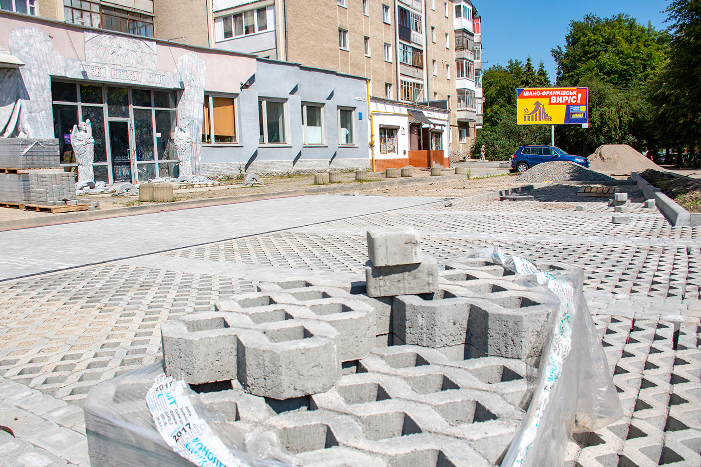 Роботи з облаштування міжбудинкових проїздів на цій локації розпочали ще минулого року. Тут передбачено облаштування тротуарів, проїжджої частини та паркувальних місць з екобруківки для автомобілів.