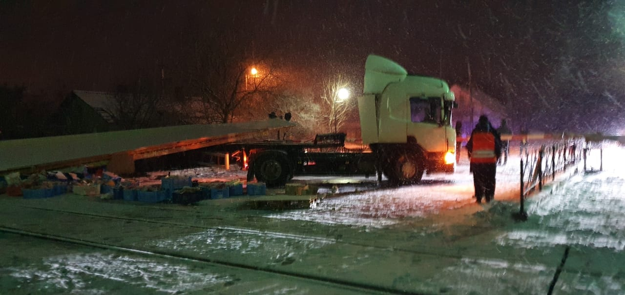 Як зазначається потяг зіткнувся з вантажівкою марки “Scania”.