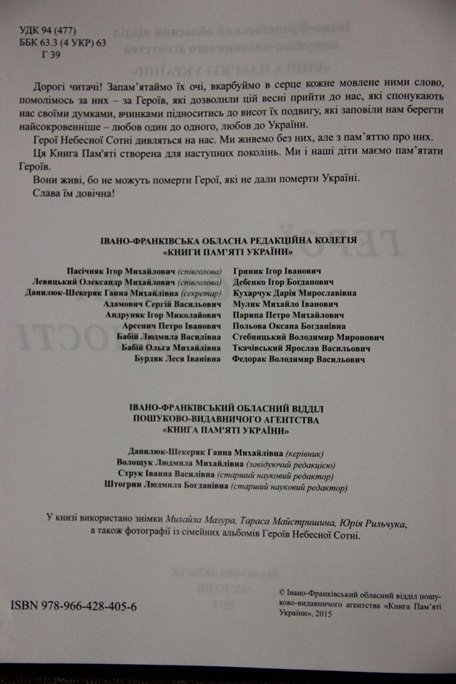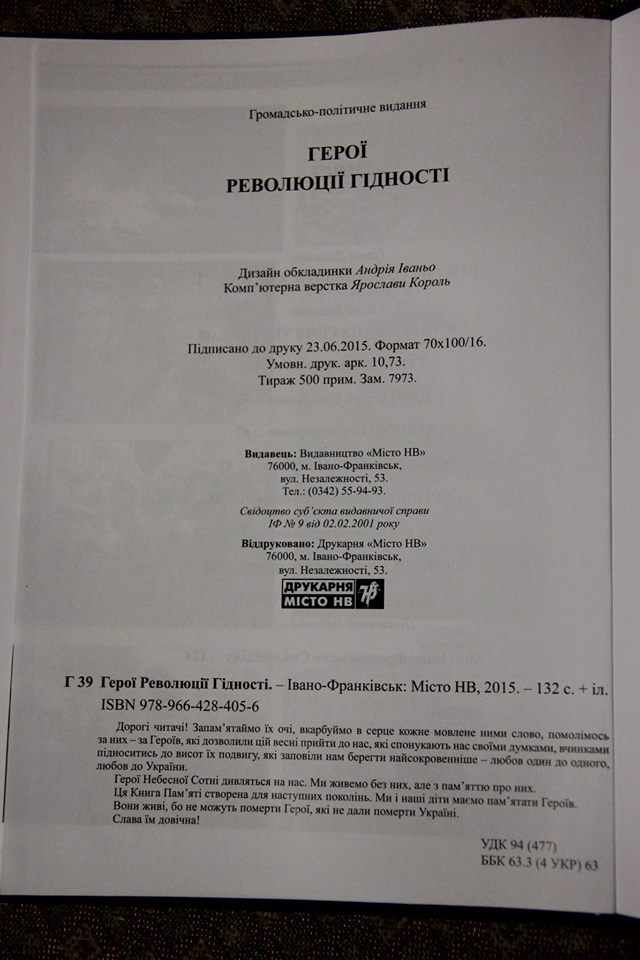 “Пост про плагіат і порушення авторського права за гроші платників податків. Зовсім випадково натрапила на одне з видань про Небесну сотню, власне, про Прикарпатську Небесну сотню. Рівно два роки тому я почала писати свої тексти про наших Героїв, які розміщувала у власному блозі на Газета ВІКНА (http://vikna.if.ua/blog/author/908). Для мене ця робота була “криком душі”, те, що я вважала своїм моральним обов’язком перед тими, хто віддав життя у тому числі і за мене. Усе, що я могла зробити для цих сміливих чоловіків, – залишити для наступних поколінь їхній реальний (зібраний з різносторонніх спогадів рідних і друзів) образ романтичних, щирих, патріотичних, мужніх, які прагнули порядку і правди в Україні. Майдан був початком – становлення європейських цінностей досі триває. І сьогодні я відчула дуже неприємний дисонанс, побачивши свої тексти без жодних змін у вищезгаданому виданні з підписом іншої людини, в деяких випадках – без зазначення авторства. Колектив упорядників, який очолює членкиня ради (увага!) етики і права обласної організації НСЖУ (http://nsju.org/page/102), заслужений журналіст України Ганна Данилюк, розвели руками, коли я прийшла до них в офіс за поясненнями. Сказали, що усі матеріали брали з інтернету (хоч це якраз нічого і не пояснює) і це не їхня вина (не їхня вина, що вони працюють методом copy-past і не перевіряють першоджерела?!). Книга, до речі, видана в рамках регіональної цільової програми підтримки книговидання, тобто за наші з вами кошти, котрі надійшли в обласний бюджет. І особливо шкода, панове, що в такого недосконалого продукту, така поважна редакційна колегія…”, – написала Євгенія Бардяк.