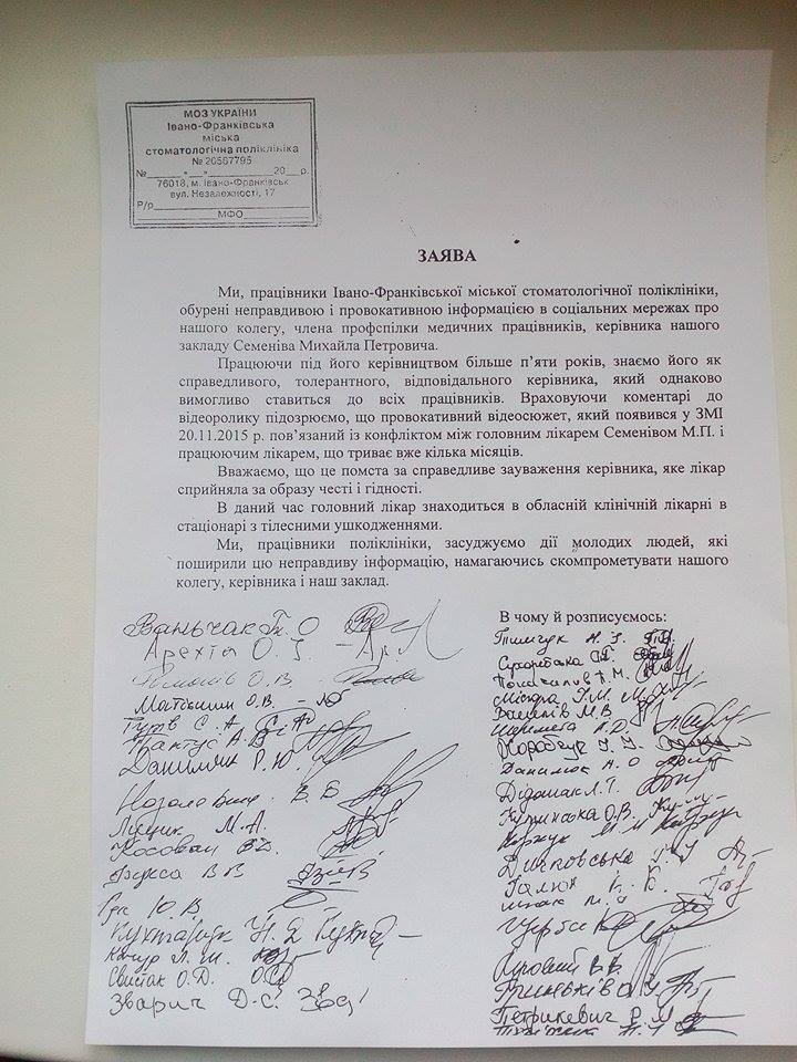 Крім того іванофранківці звинувачують Михайла Семеніва у здирництві з лікарів та пацієнтів поліклініки у форматі так званих “благодійних внесків”.