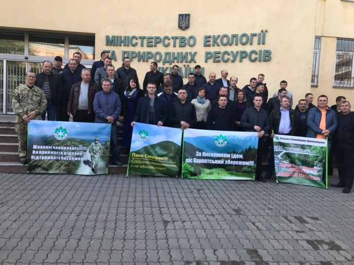 Майже 60 науковців, лісничих та інших працівників КНПП прийшли до будівлі Мінприроди з плакатами, якими закликають конкурсну комісію до зваженого рішення, а Міністра екології Остапа Семерака – "слідувати за переконаннями, а не обставинами".