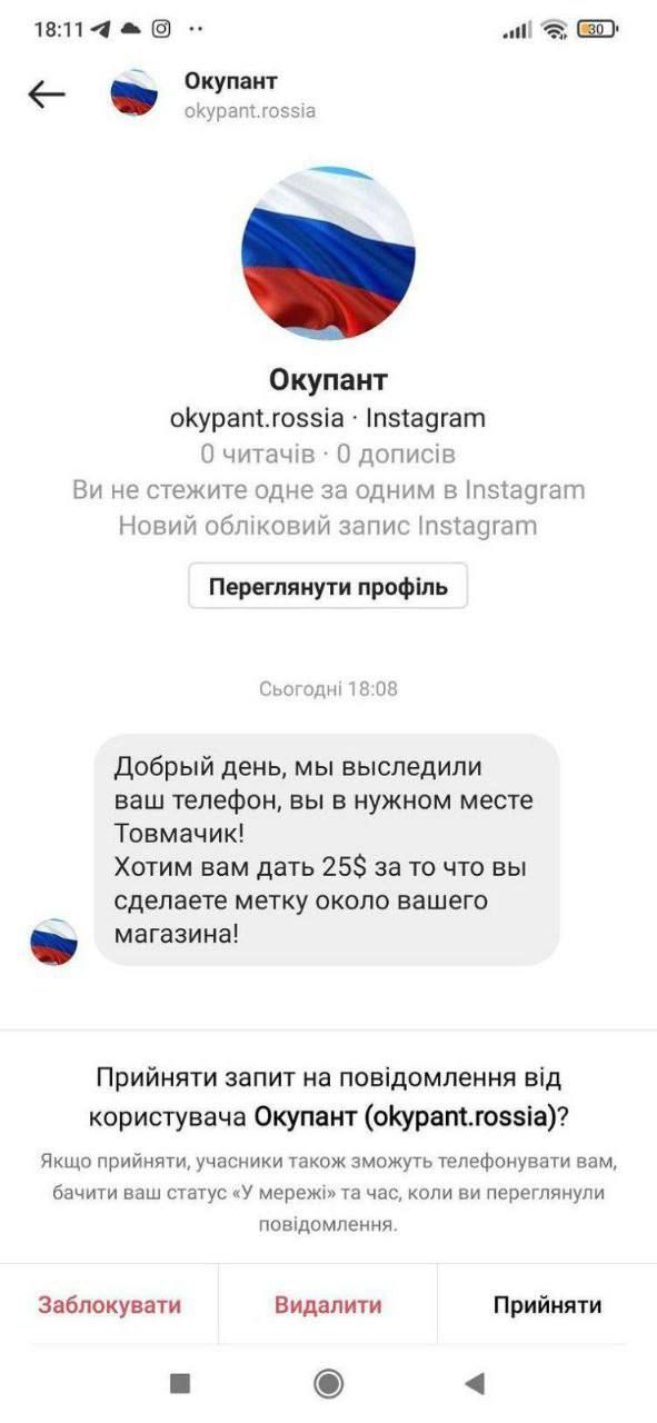 Один зі свідомих мешканців передав правоохоронцям скриншот листування з російськими окупантами.