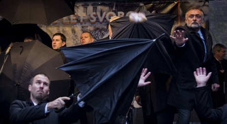 Після того, як з натовпу на сцену полетіли яйця, окорона спробувала захистити президентів парасольками.