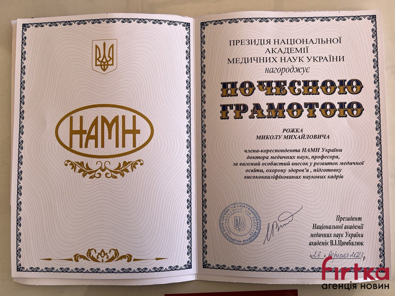 Президія Національної академії наук України нагородила почесною грамотою Миколу Рожка, члена-кореспондента НАМН України, доктора медичних наук та професора за вагомий особистий внесок у розвиток медичної освіти, охорону здоров'я та підготовку висококваліфікованих наукових кадрів.