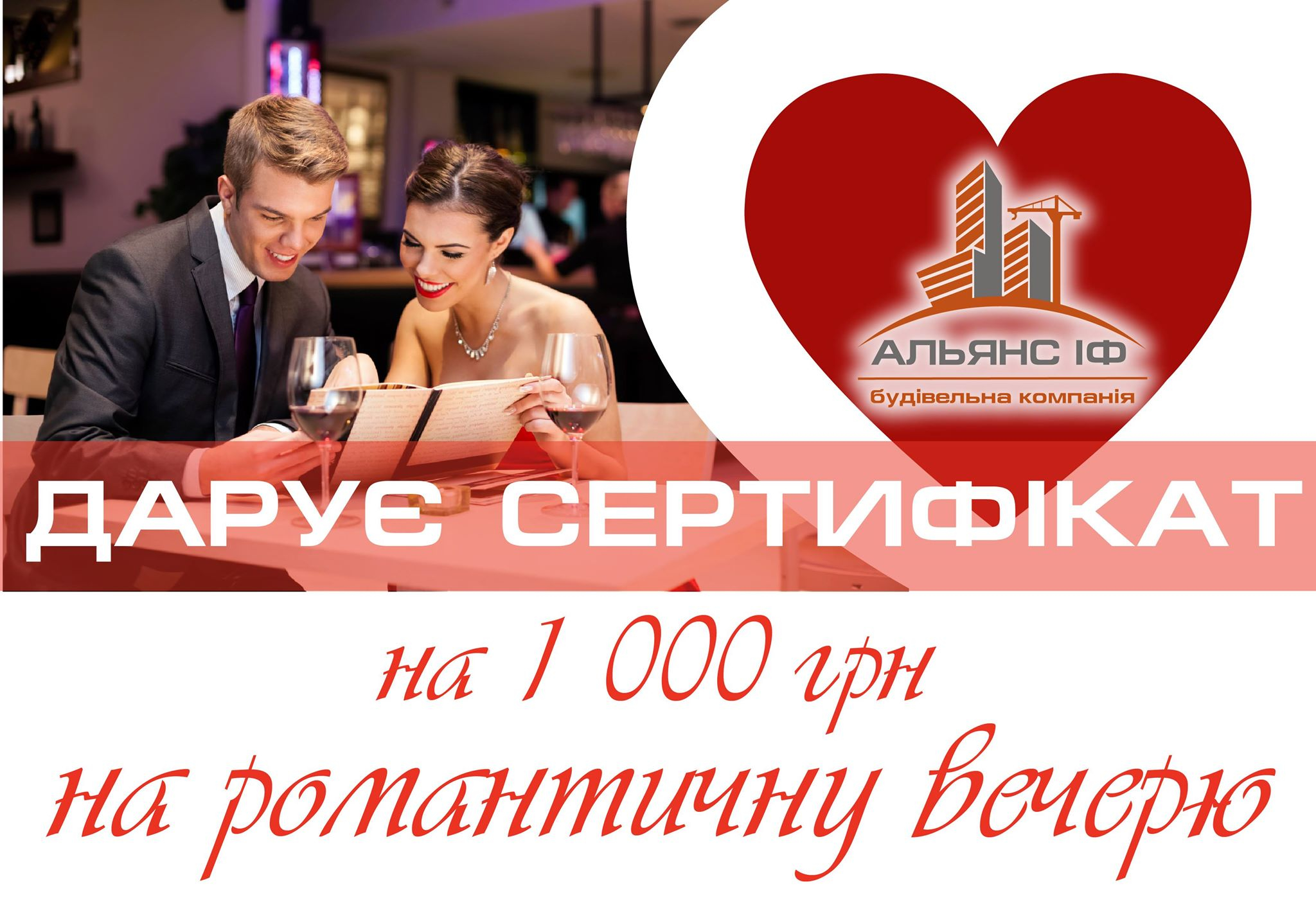 До дня закоханих будівельна компанія «Альянс ІФ» підготувала приємний сюрприз для своїх клієнтів – сертифікат на романтичну вечерю на двох на суму 1000 грн.