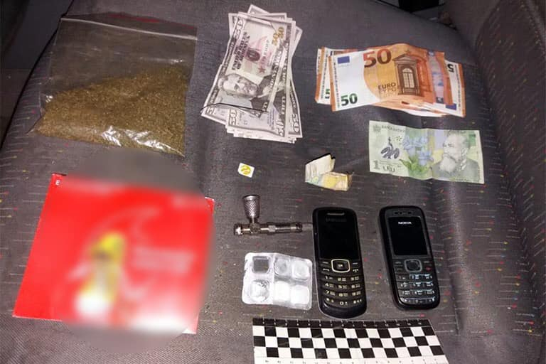 Крім того, при поверхневій перевірці салону автомобіля поліцейські виявили поліетиленовий пакет з подрібненою сухою речовиною, ззовні схожою на наркотичний засіб «марихуану», металевий предмет зовні схожий на пристрій для викурювання, а також грошові купюри євро та доларів з позначкою «сувенір».