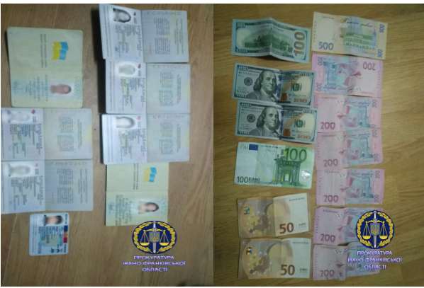 В ході санкціонованих обшуків проведених під процесуальним керівництвом прокуратури оперативними працівниками УСБУ в області та слідчими-детективами СУ ГУНП в області в офісі зловмисника виявлено та вилучено паспорти громадян, печатки, штампи, чорну бухгалтерію, грошові кошти та інше.