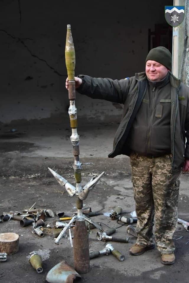 Військові змайстрували новорічне дерево з розірваних снарядів від окупантів.