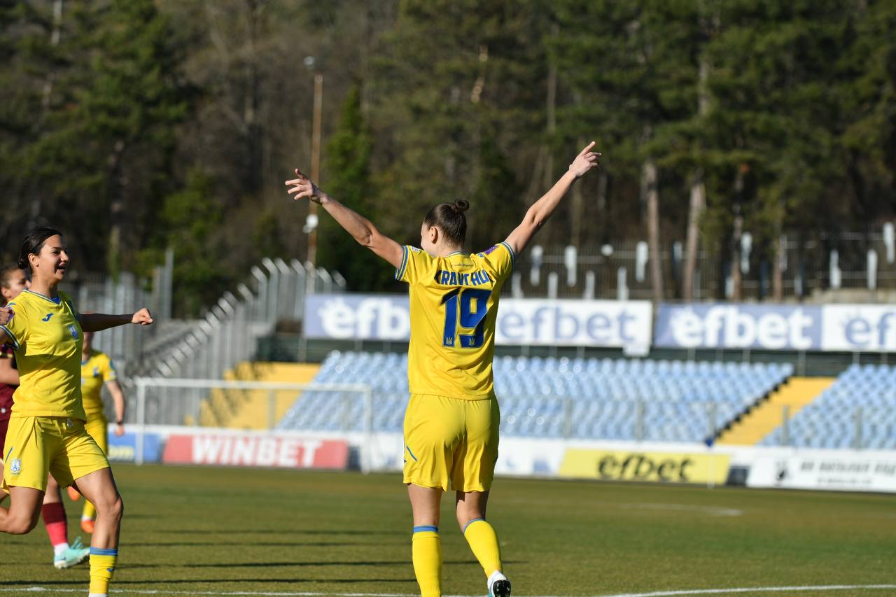 Синьо-жовті повели в рахунку вже на 6-й хвилині, коли Кравчук скористалася передачею Андрухів і перекинула голкіпера. Українки продовжили володіти ініціативою, створювали моменти, і в середині першого тайму вже Андрухів із паса Овдійчук подвоїла перевагу гостей.