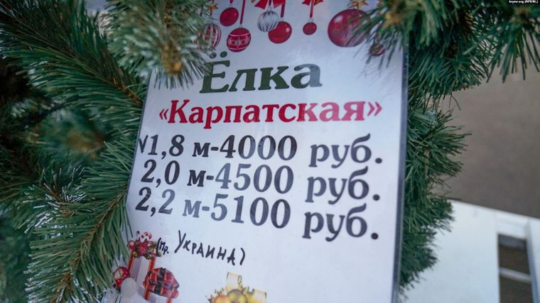 У центрі Сімферополя, на новорічному ярмарку під будівлею музичного театру на проспекті Кірова, продаються штучні ялинки, виготовлені в Івано-Франківській області.