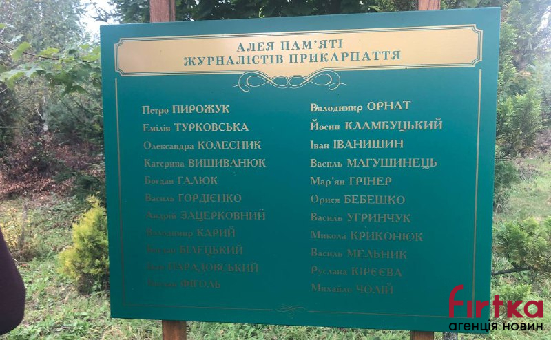 Саму алея дерев висадили в с. Остриня Тлумацького району ще у 2010 році. Поруч з алеєю знаходиться Знак пам'яті із вписаними 67 іменами непересічних постатей прикарпатської журналістики, котрі уже відійшли у засвіти, повідомляє журналістка Фіртки.