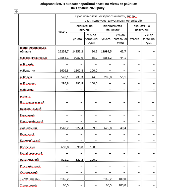 На 1 травня загальна сума заборгованості з виплати заробітної плати становила 26,2 млн грн, з неї 14,3 млн грн припадало на економічно активні підприємства.