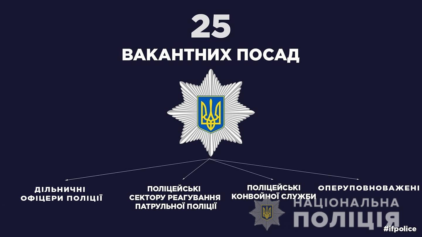 "На Івано-Франківщині в Головному управлінні поліції розпочався конкурс на посаду дільничного офіцера поліції (5 вакансій), поліцейського сектору реагування патрульної поліції (10 місць), оперуповноваженого (5 місць) та поліцейського конвойної служби (5 вакансій)", - йдеться у повідомленні.