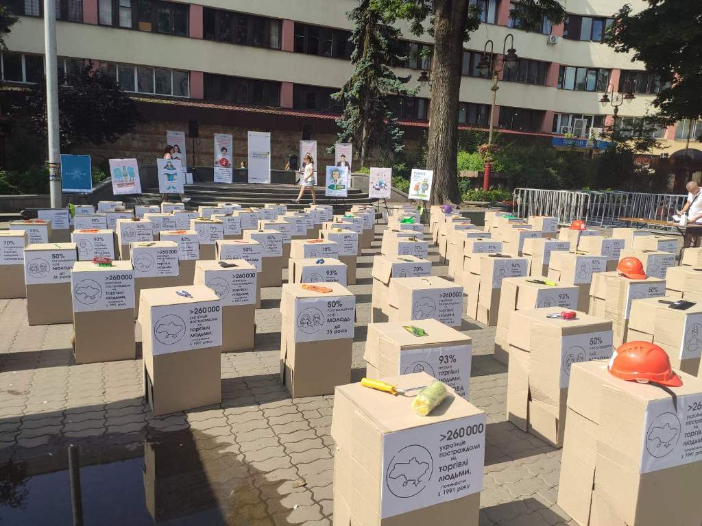Основна мета заходу - інформування населення щодо проблеми торгівлі людьми та ознайомлення із правилами безпечного працевлаштування і поїздок за кордон. Учасники акції мали можливість переглянути інсталяцію у вигляді 93 коробок, на яких розміщувалися робочі інструменти, засоби для чищення та прибирання. Це невипадково: 93% постраждалих від торгівлі людьми – це трудова міграція.
