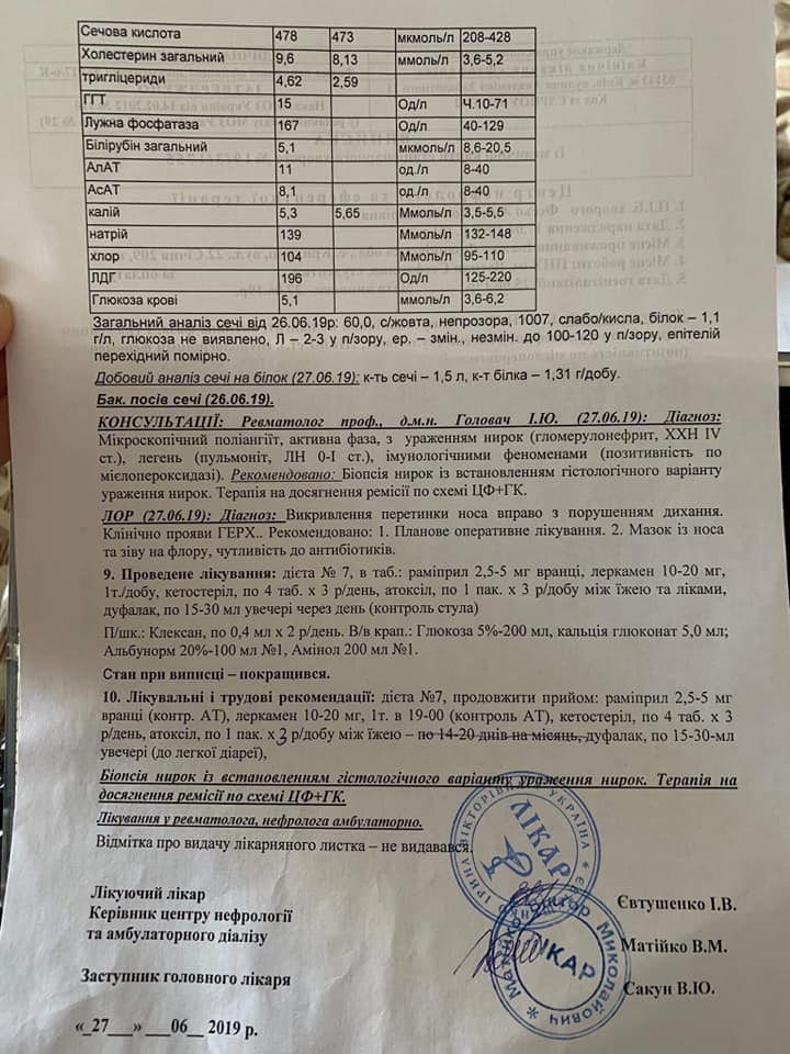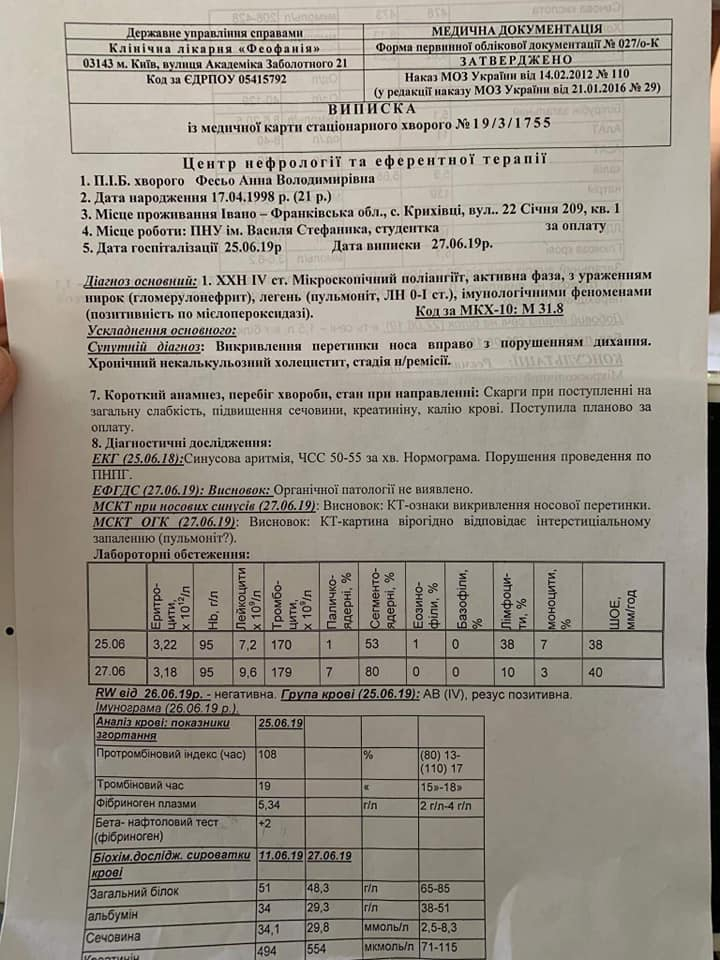 При здачі багатьох аналазів у Київській лікарні «Феофанії» підтвердили, що у дівчини відмовили нирки (гломерулонефрит) і поставили такий діагноз: Мікроскопічний поліангіїт в активній фазі ІV ступення.
